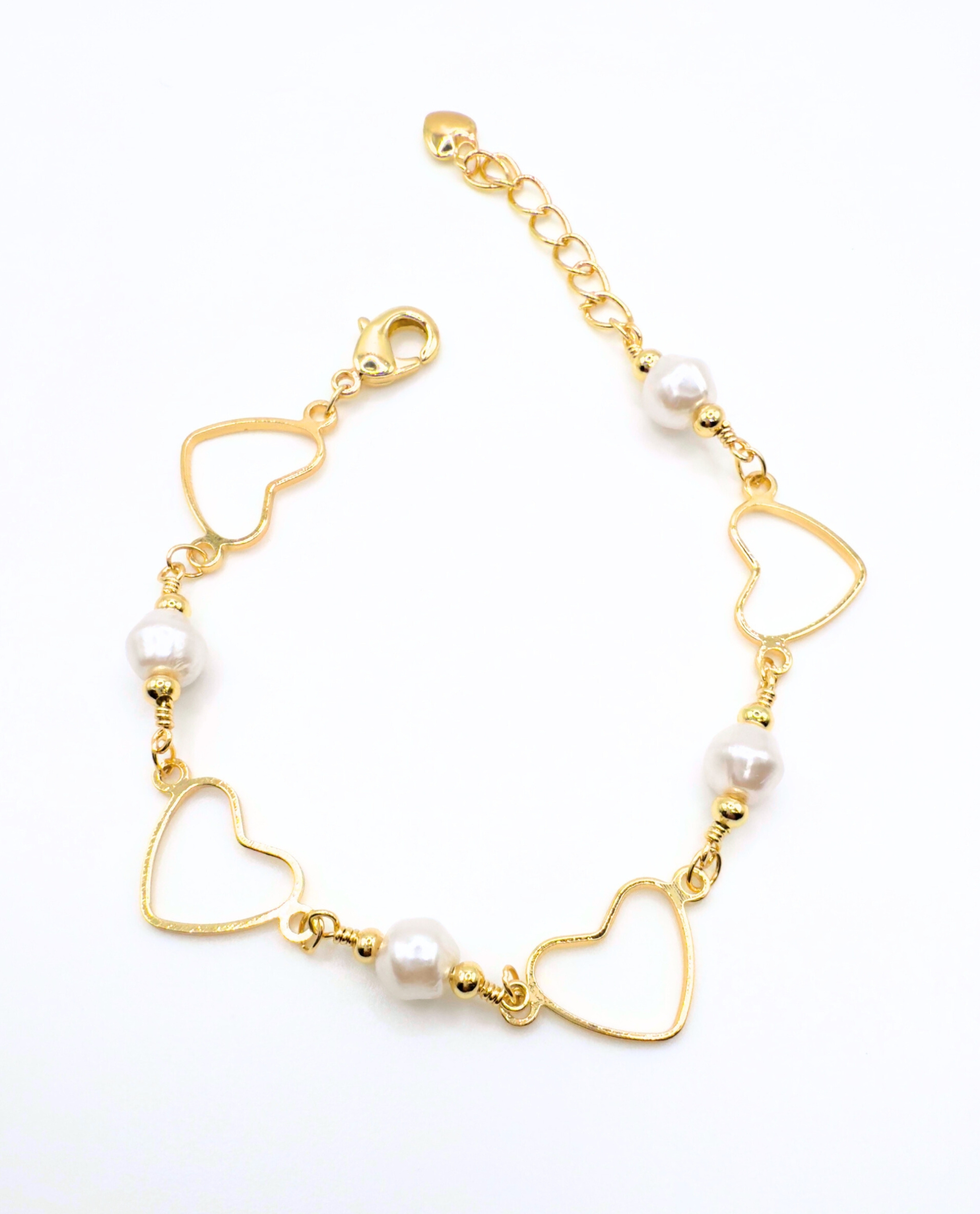 Romantic and effortlessly elegant, the Hearts & Haze Bracelet is a fun touch to your every day look. Delicate open heart charms and luminous faux pearls are linked on a dainty chain, creating a feminine piece perfect for everyday wear or special moments.