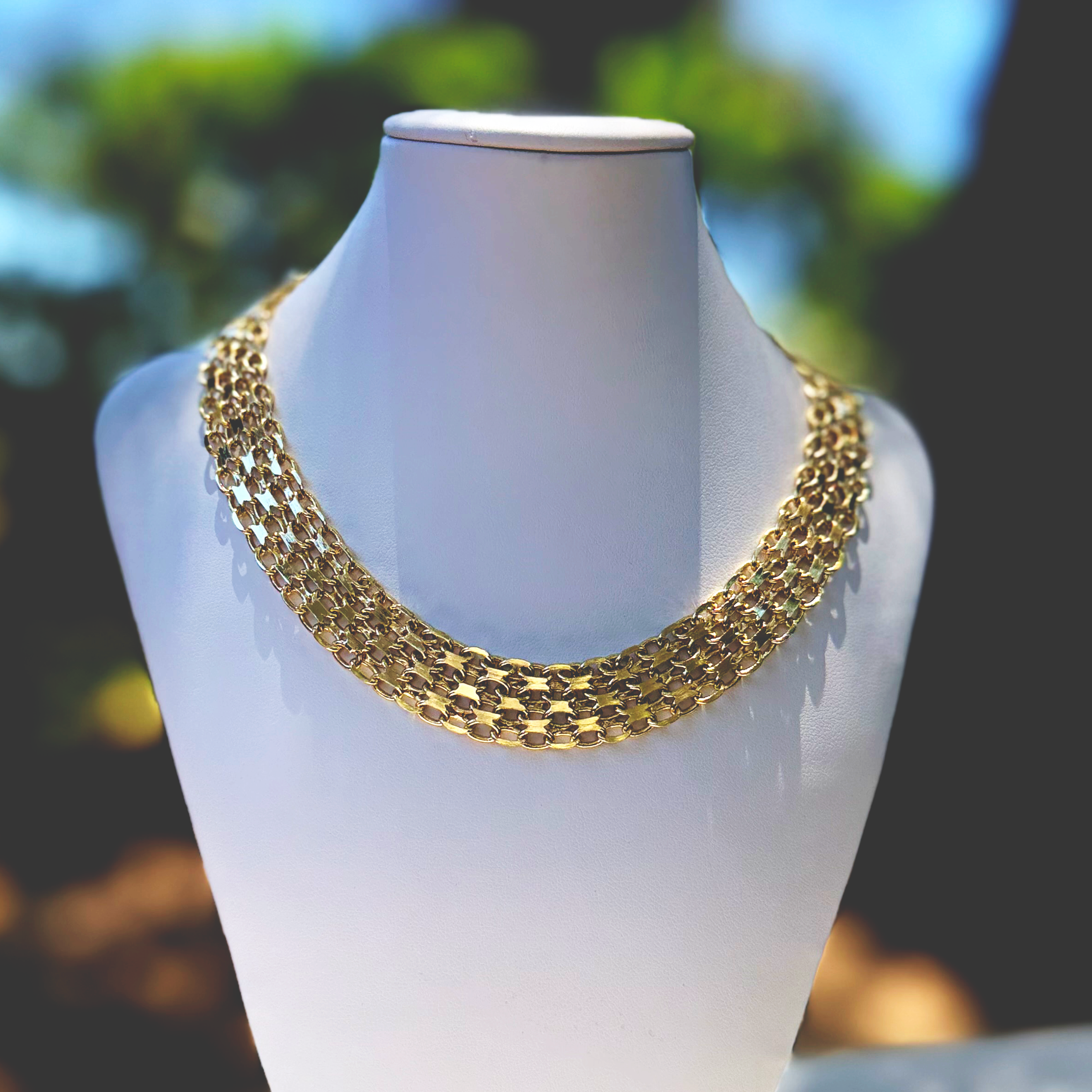 Make a statement with the Solstice Chain Collar, a bold and sophisticated multi layered necklace designed to command attention. Featuring three rows of high shine rectangular links, this piece offers the perfect balance of strength and elegance. Whether worn with a sleek neckline or layered with your favorite basics, it’s a versatile showstopper that adds instant polish to any outfit.