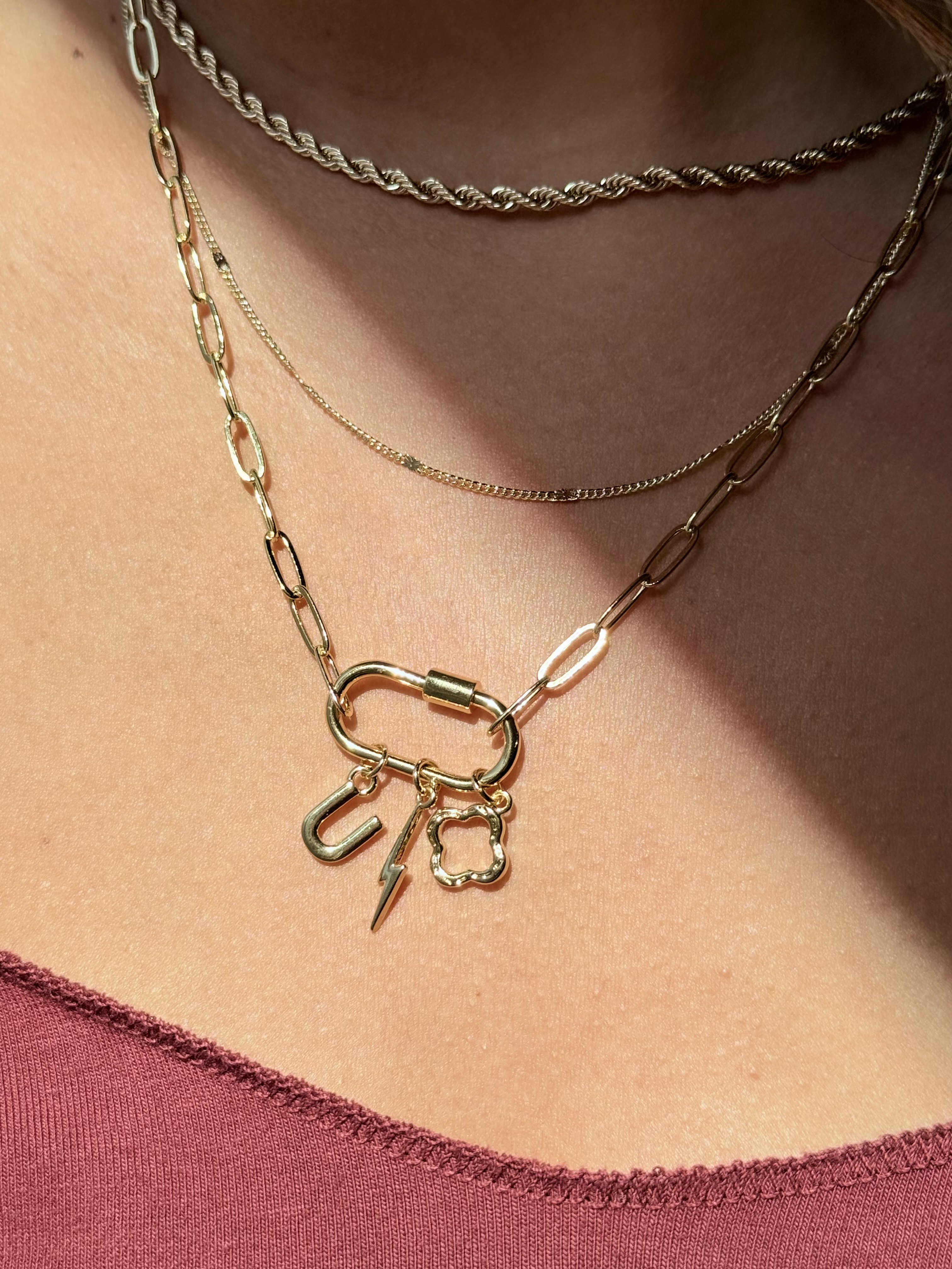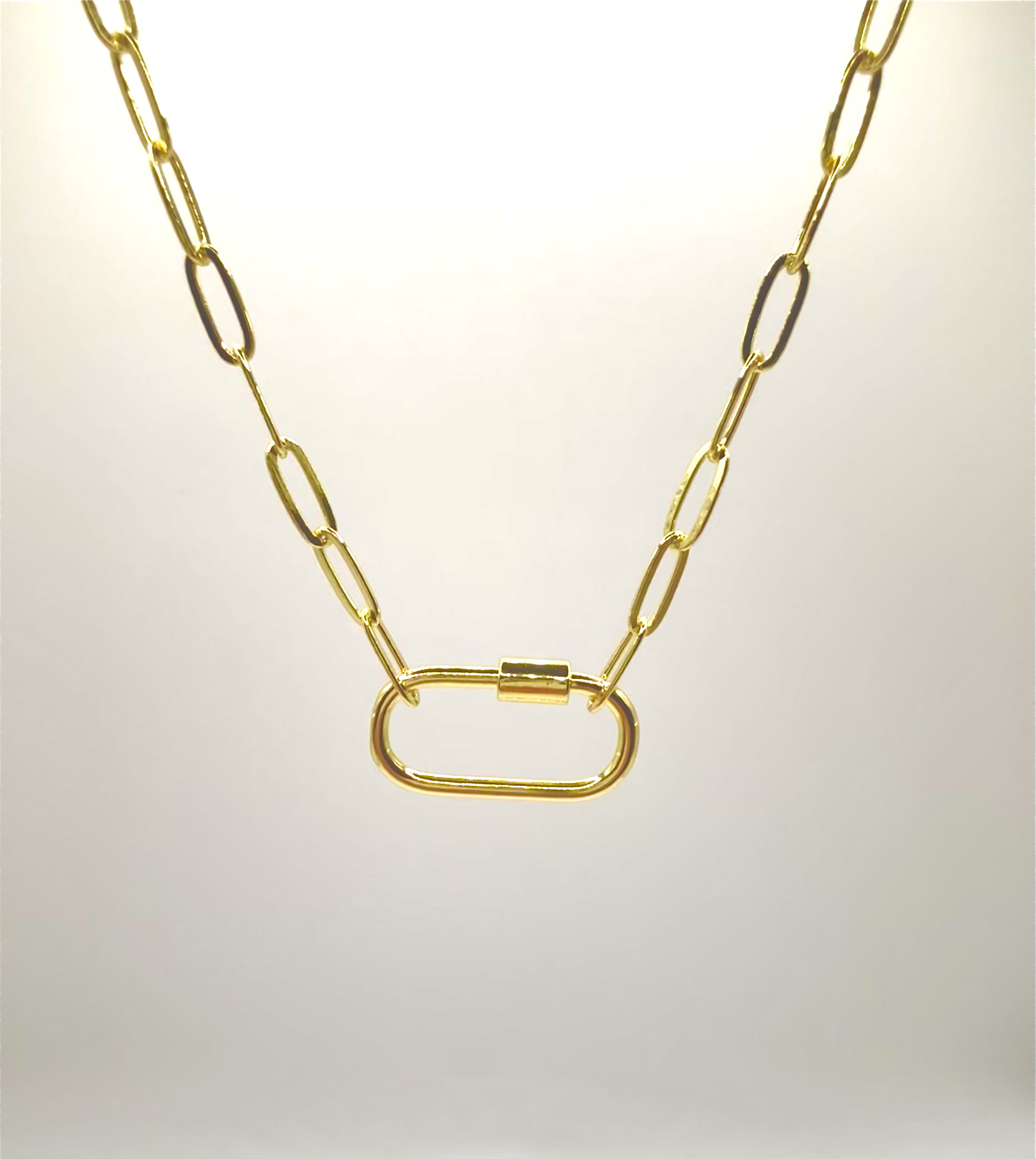 Celebrate timeless connections with the Amara Link Necklace, a modern paperclip chain finished with a sleek gold filled carabiner clasp. Designed for versatility, the carabiner doubles as a charm holder, allowing you to personalize your piece with pendants, pearls or initials. A versatile piece wear solo, layered, or with charms that tell your story. Perfectly suited for everyday wear or meaningful gifting.